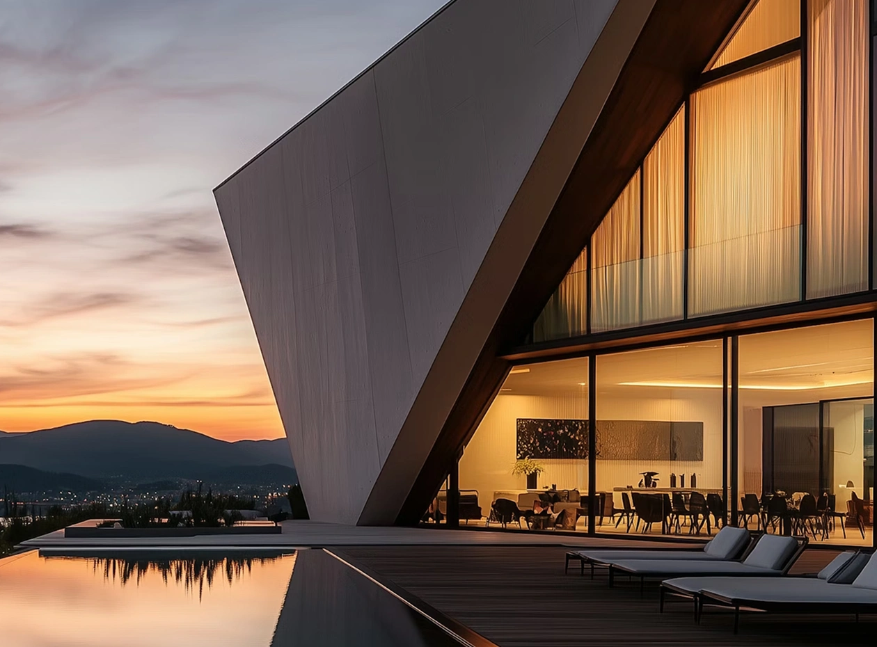Material selection focused on longevity and low maintenance, combining exposed board-formed concrete with weathered steel screens and floor-to-ceiling glazing that frames panoramic views toward the surrounding hills.